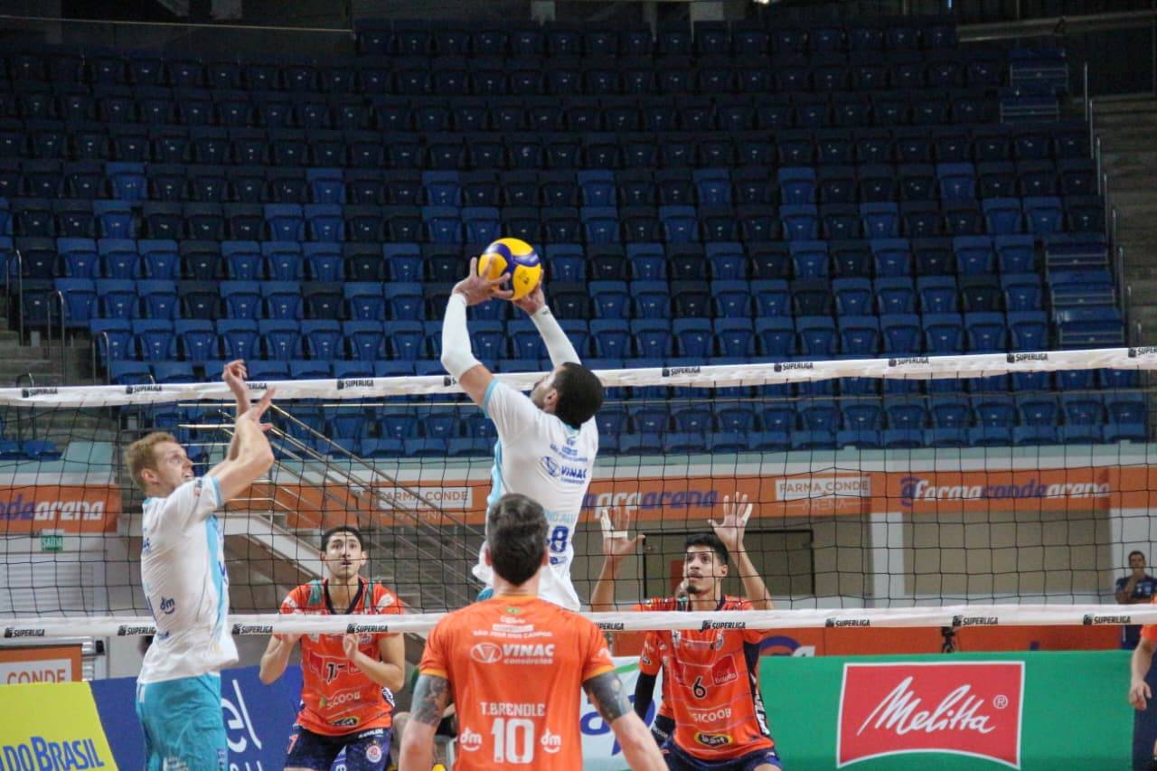 O técnico Flávio Tavares iniciou o duelo com Davy Moraes, Sérgio Camargo, Deivid, Victor Babu, Bruno Canhoto, Biella e o líbero Tiago Brendle.